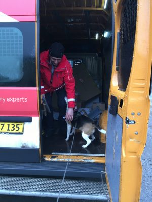 I met him at the parking lot one day, and I was so happy to see him that I jumped into his van, which was filled with packages, to help him.